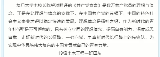长科建筑工程学院19级土木工程一班田东说:“生逢其时,肩负重任,作为新时代的青年,作为长科的学子,要树立坚定的理想信念,厚植青年一代对马克思主义的信仰、坚定对中国特色社会主义的信念,真正的做到信仰如山、信念如铁、信心如磐,努力为实现中华民族伟大复兴的中国梦贡献智慧和力量。