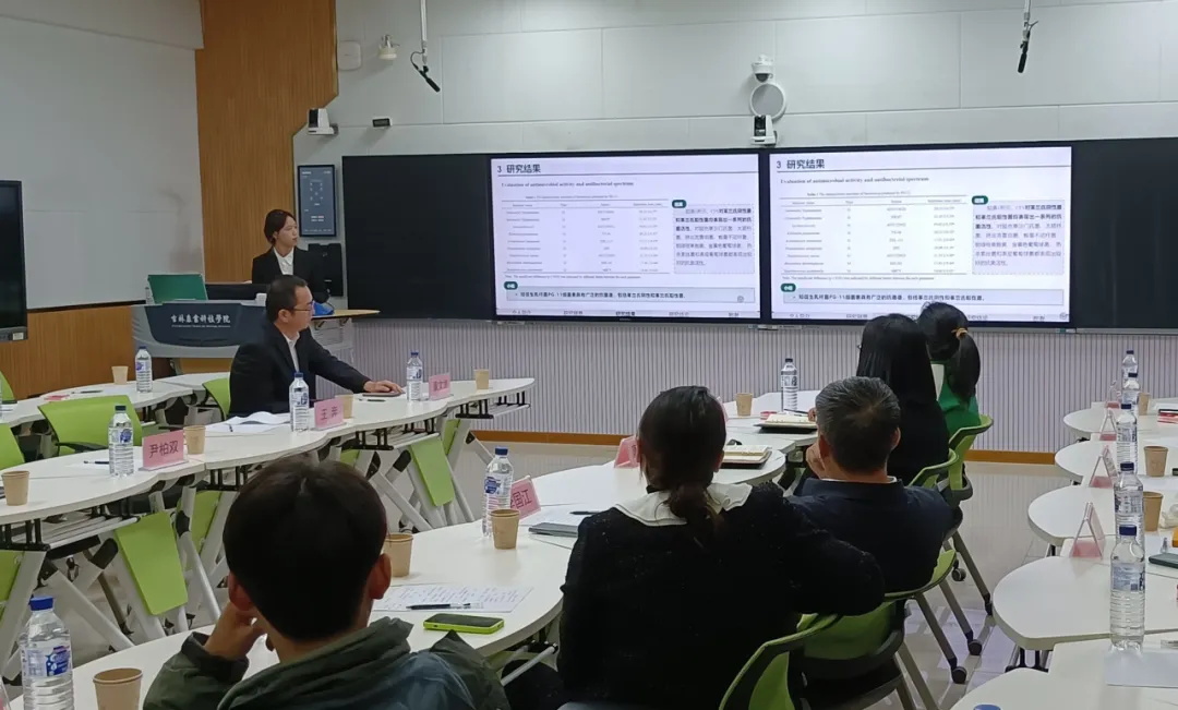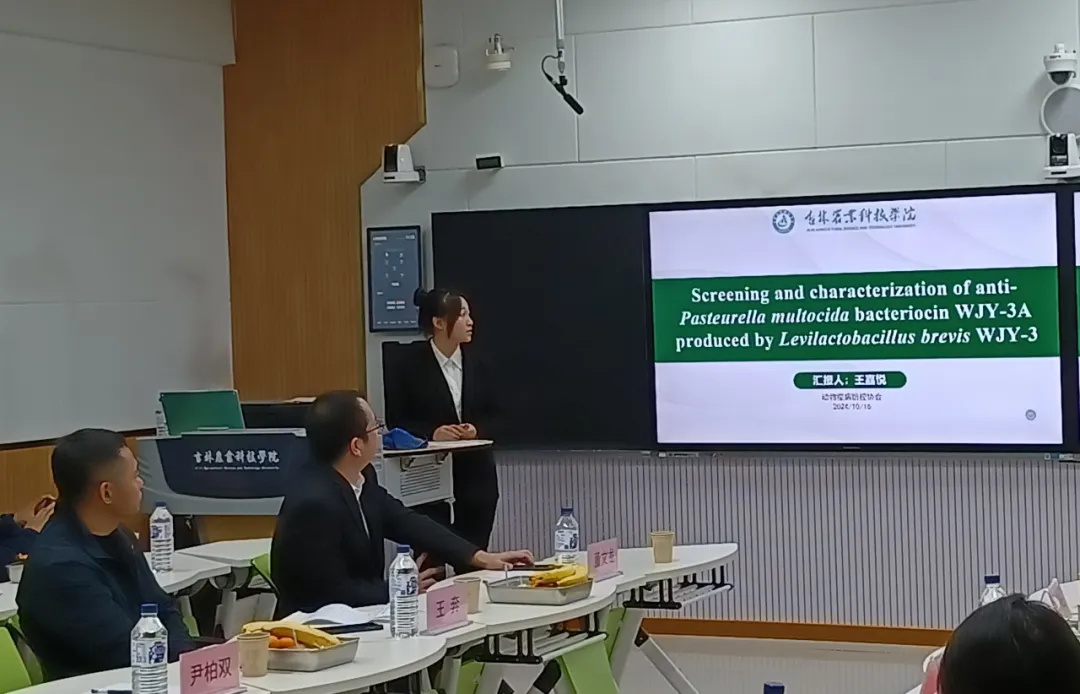 为直观展示吉林农业科技学院科研育人的丰硕成果。潘果、田叶铮铮、王嘉悦、苏惠、许诺五位同学分别进行了学术汇报,涉及论文选题背景、实验设计思路及研究成果,充分展现了学生们的科研潜力和创新能力。