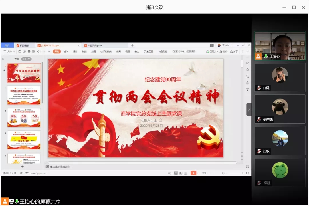 为了纪念中国共产党建党99周年,贯彻落实《长春科技学院教工党支部与学生党支部共建活动实施方案》及关于印发《开展“七一”主题党日活动方案》的通知等相关文件精神,加强我院教工党支部和学生党支部之间的沟通与交流,丰富党员党内生活,进一步推进我院党建工作建设。6月28日下午,我院教工党支部和学生党支部共同召开了“纪念建党99周年——贯彻两会精神”线上主题党课,此次党课通过腾讯会议的方式进行,由学生党支部书记韩雪主持,教工党支部书记王立主讲。
