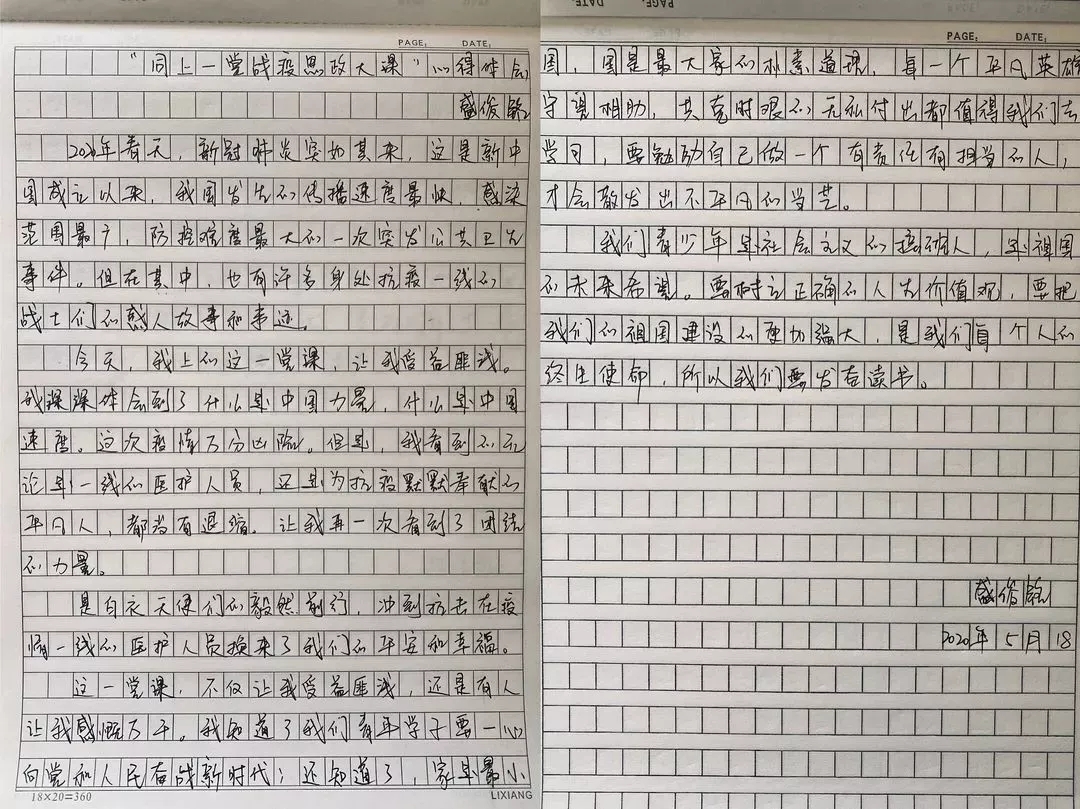 视觉艺术学院分团委第一副书记盛俊铭同学在体会中写道:“一场在中国率先爆发的新冠疫情,让全世界看到了众志成城的中国人的凝聚力和爆发力。中国人民在疫情防控中展现的中国力量、中国精神、中国效率,作为当代大学生,更应该肩负起年轻人的责任,绽放最美青春。”