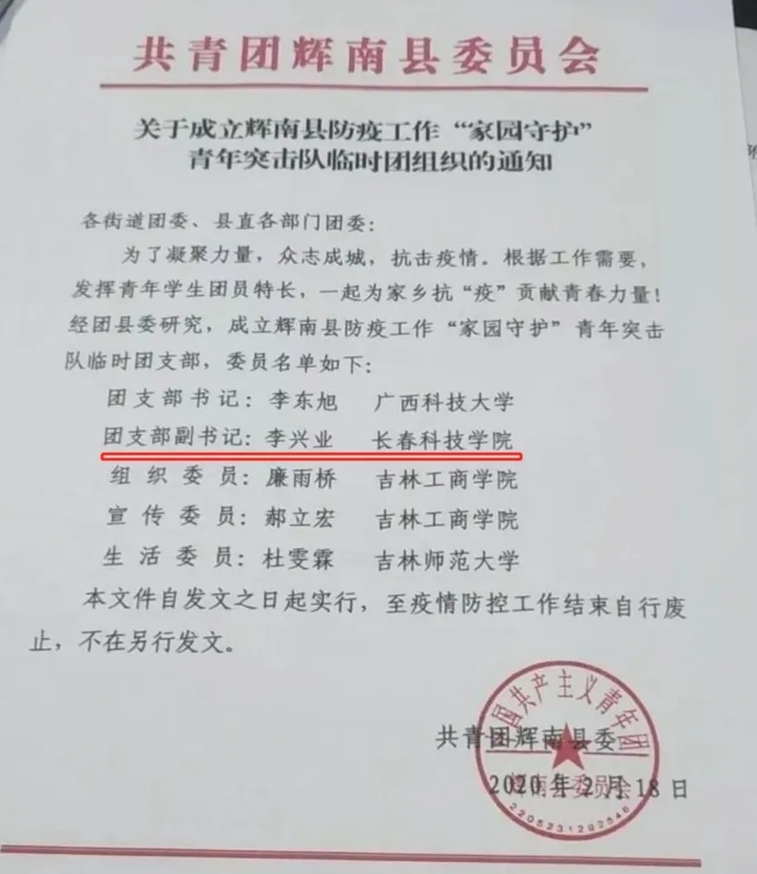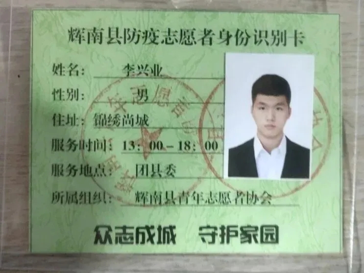 “李兴业同学,用青春筑防,愿山河无恙。在新冠肺炎疫情期间,作为辉南县防疫工作‘家园守护’青年突击队一员,你沖锋在家乡疫情防控一线,用实际行动,诠释了使命与担当,充分发挥了先鋒模范作用,圆满完成了志愿服务任务。” “勇于攻坚克难、守护家园平安。展现青年担当、贡献青春力量,充分弘扬了奉献、友爱、互助、进步的志愿精神!” 共青团辉南县委在为他颁发的荣誉书和荣誉证书中写道。