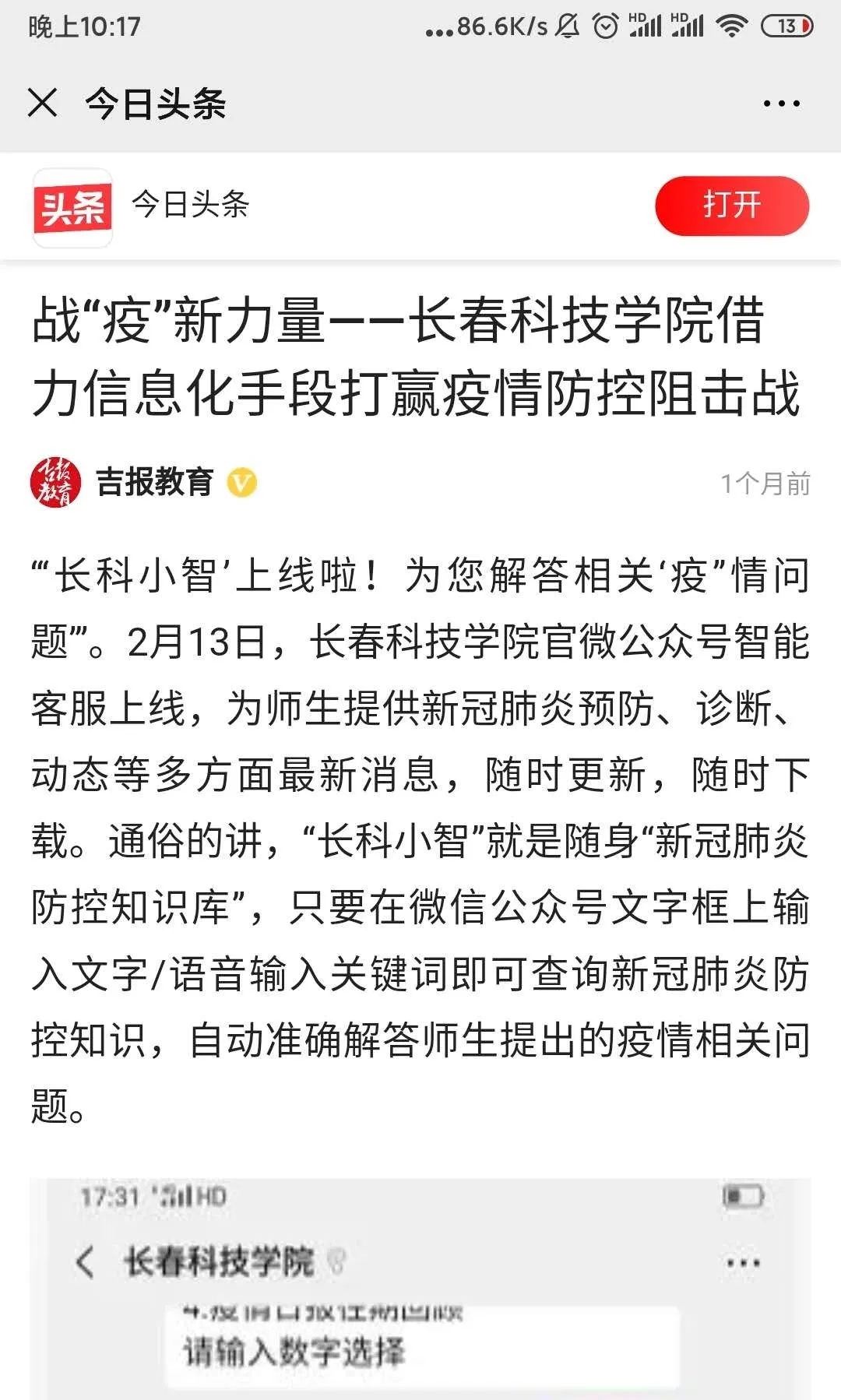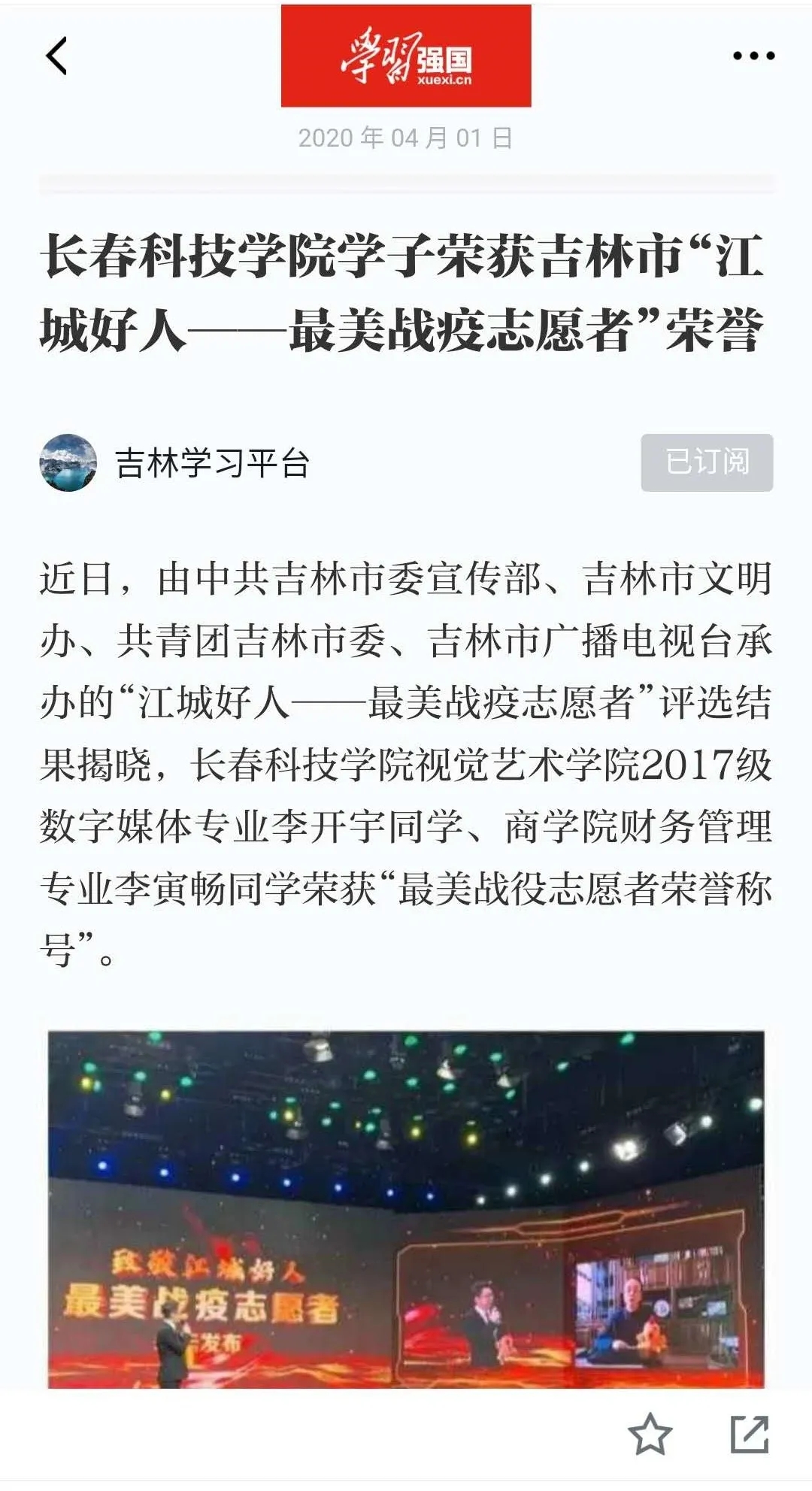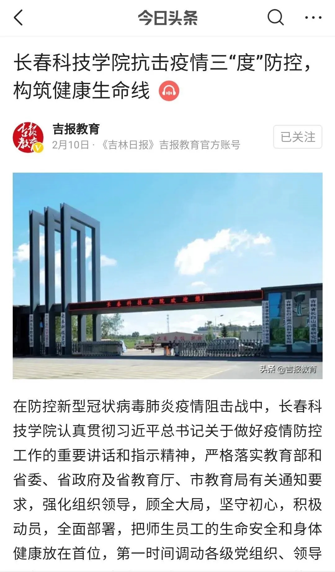 目前,人民网、学习强国、中国大学生在线(微信、喜马拉雅)、吉报彩练新闻、中国新闻网、吉林日报、吉林省教育厅官方网站、吉林省高校思政网、中国教育在线、今日头条吉报教育、zaker新闻等多家媒体采用转载学校防控报道80余篇(次),提升了学校形象。