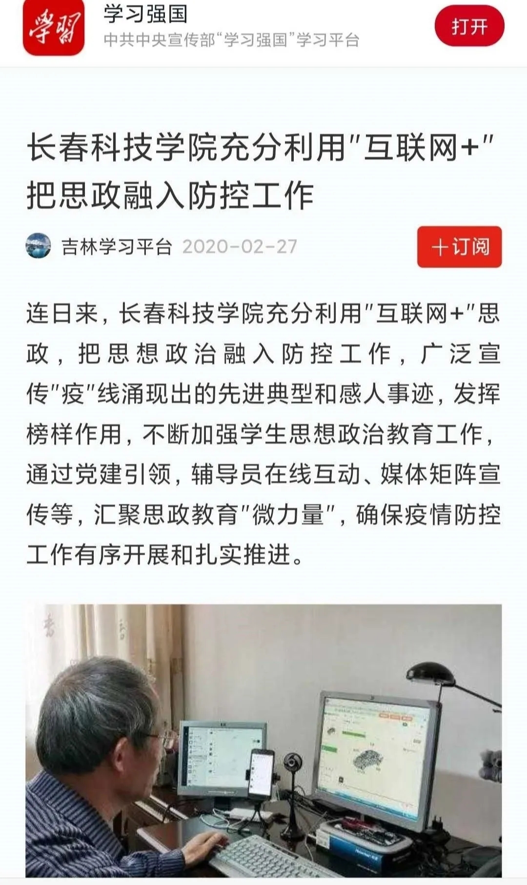 学校在做好疫情防控,积极开展线上教学工作的基础上,将课程思政贯穿于线上教学课程中,深入挖掘疫情防控育人元素,用好战“疫”课堂,践行立德树人。2月21日,长春日报《在疫情防控一线彰显教育责任担当》,4月1日吉林省高校网络思政中心以《长春科技学院:学生热议习近平总书记给北大援鄂医疗队的回信》为题对学校开展思政教育课进行了报道。