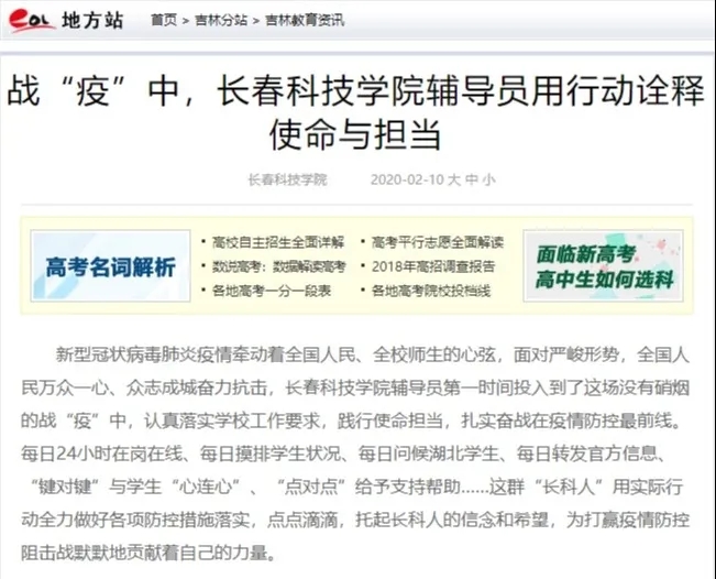 2月4日中华大教育网以《一封来自长春科技学院的"请战书"》报道了学校终身教授孙长林率先垂范、积极请战的事迹。2月10日,中国教育网以《战“疫”中,长春科技学院辅导员用行动诠释使命与担当》为题对我校辅导员第一时间投入战“疫”,认真落实学校工作要求,践行使命担当, “键对键”与学生“心连心”、“点对点”服务,坚定学生抗疫信心决心事迹进行了报道。