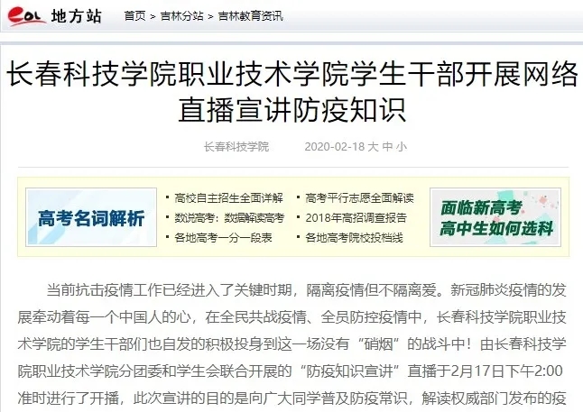 与时间赛跑,与病毒较量。在这场史无前例的疫情阻击战中,学校发挥信息化技术在疫情防控中的重要作用,依托校信息化平台优势科学有效应对疫情,与“疫魔”拼速度,拉长扎稳疫情 “防控”线,持续加强疫情防控阻击战斗力度,第一时间启动实施疫情防控服务专区,帮助师生足不出户掌握疫情动态、官方通报、健康知识等信息,牢牢把握正确舆论导向,全面提高舆论引导能力,同舟共济、科学防治。2月14日、18日吉报教育、中国教育在线以《长春科技学院借力信息化手段打赢疫情防控阻击战》、《长春科技学院职业技术学院学生干部开展网络直播宣讲防疫知识》为题对学校科技防疫情况进行了报道。