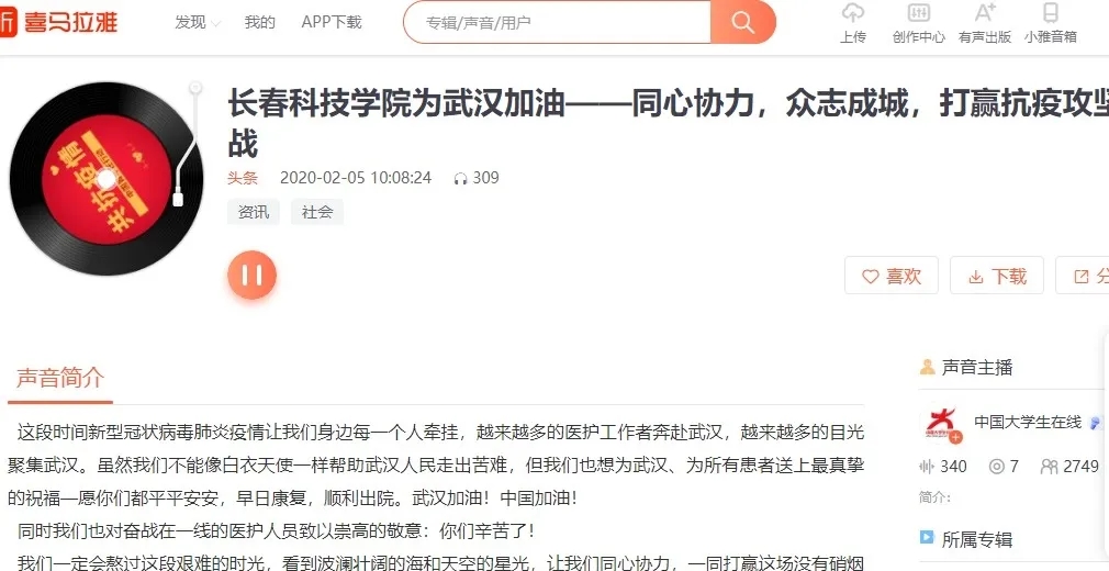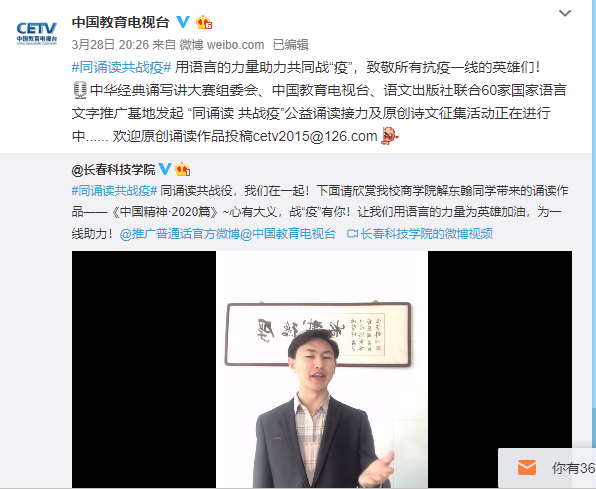 跳动音符,迸发力量;魅力歌声,致敬一线。学校团委书记李可心原创歌曲《一起》入选人民网《“人民同心 抗击疫情”吉林省优秀文艺作品网络展播》,同时中国大学生在线、吉报教育分别以《高校在行动 | 扬起歌声的力量!》《共同战“疫”!长春科技学院用歌声为中国加油》为题报道。用语言的力量助力共同战“疫”,中国教育电视台官方微博转发我校商学院解东翰同学诵读作品——《中国精神,2020篇》。