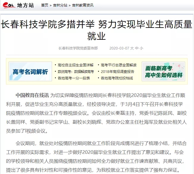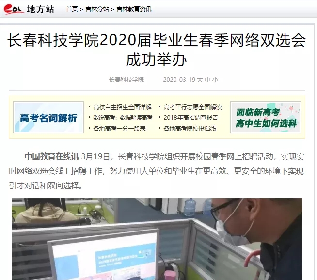 面对疫情,学校变被动为主动,化"危“为机,多次召开视频会议,研究特殊时期大学生就业工作的思路策略,通过开展“云宣讲”、“云面试”,“网络双选会”等为毕业生争取更多就业机会。3月7日,中国教育在线以《长春科技学院多措并举,努力实现毕业生高质量就业》为题对学校做好毕业生就业做法进行了报道,获得2020届毕业学子高度关注。