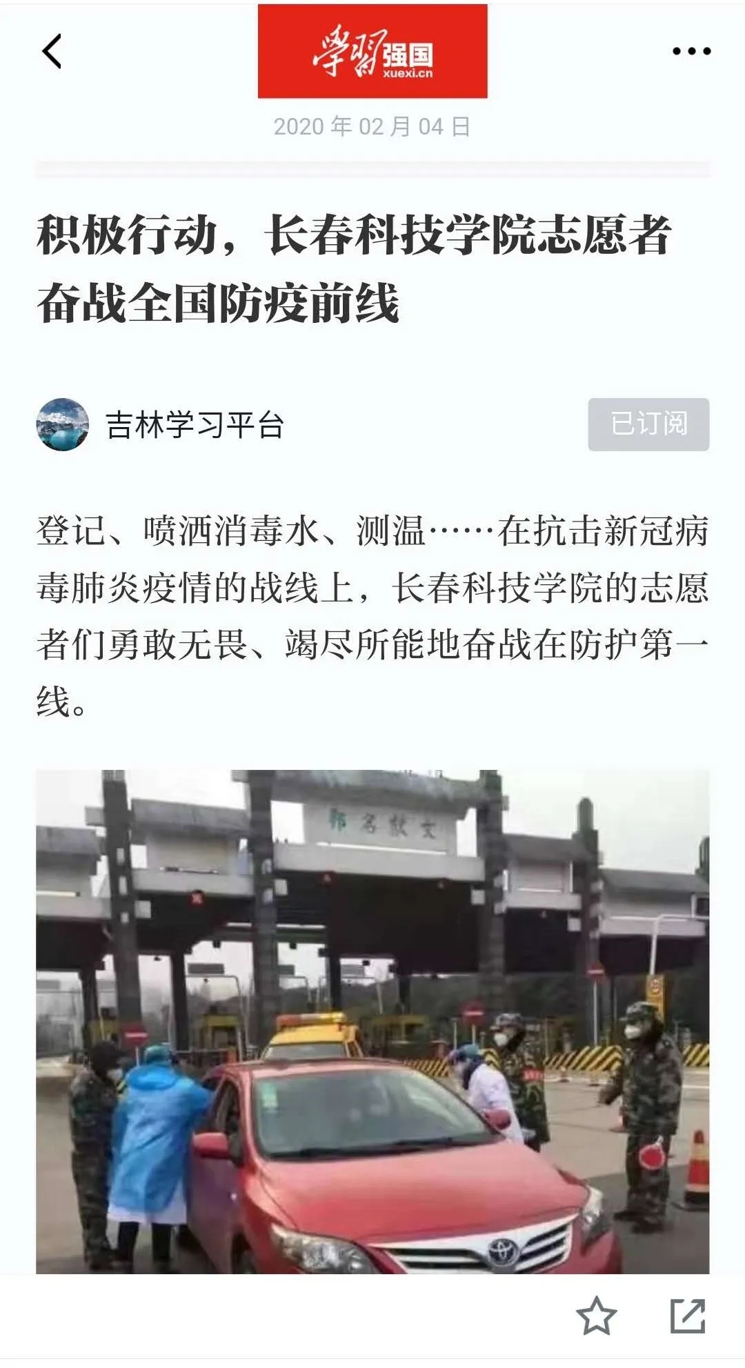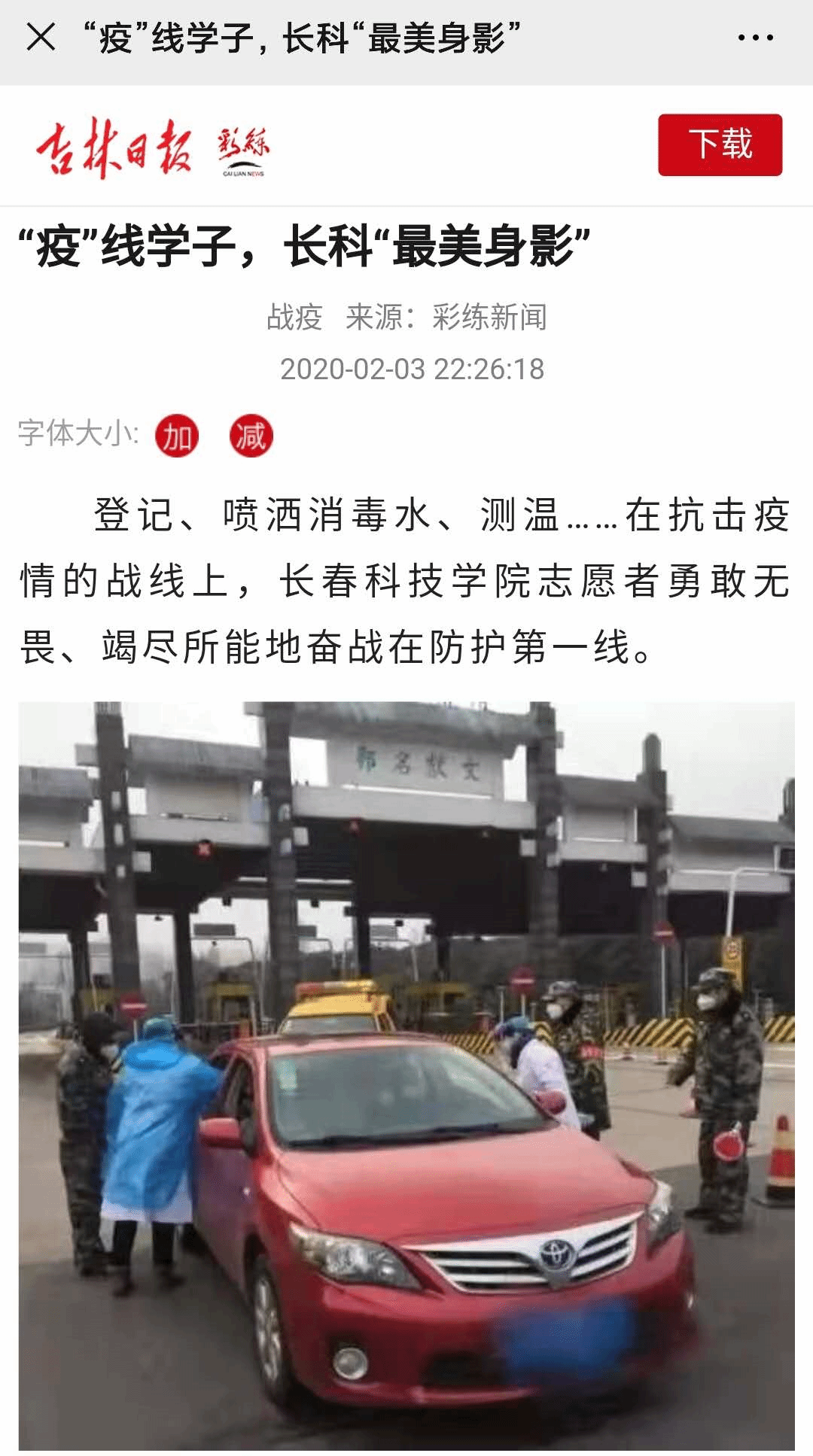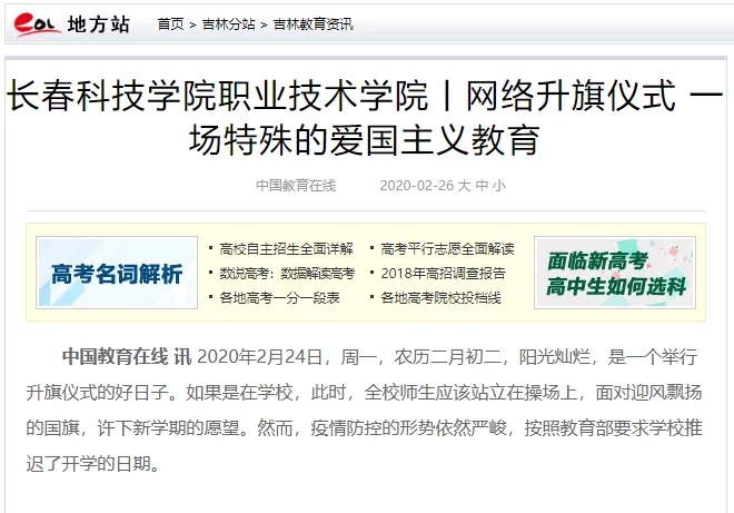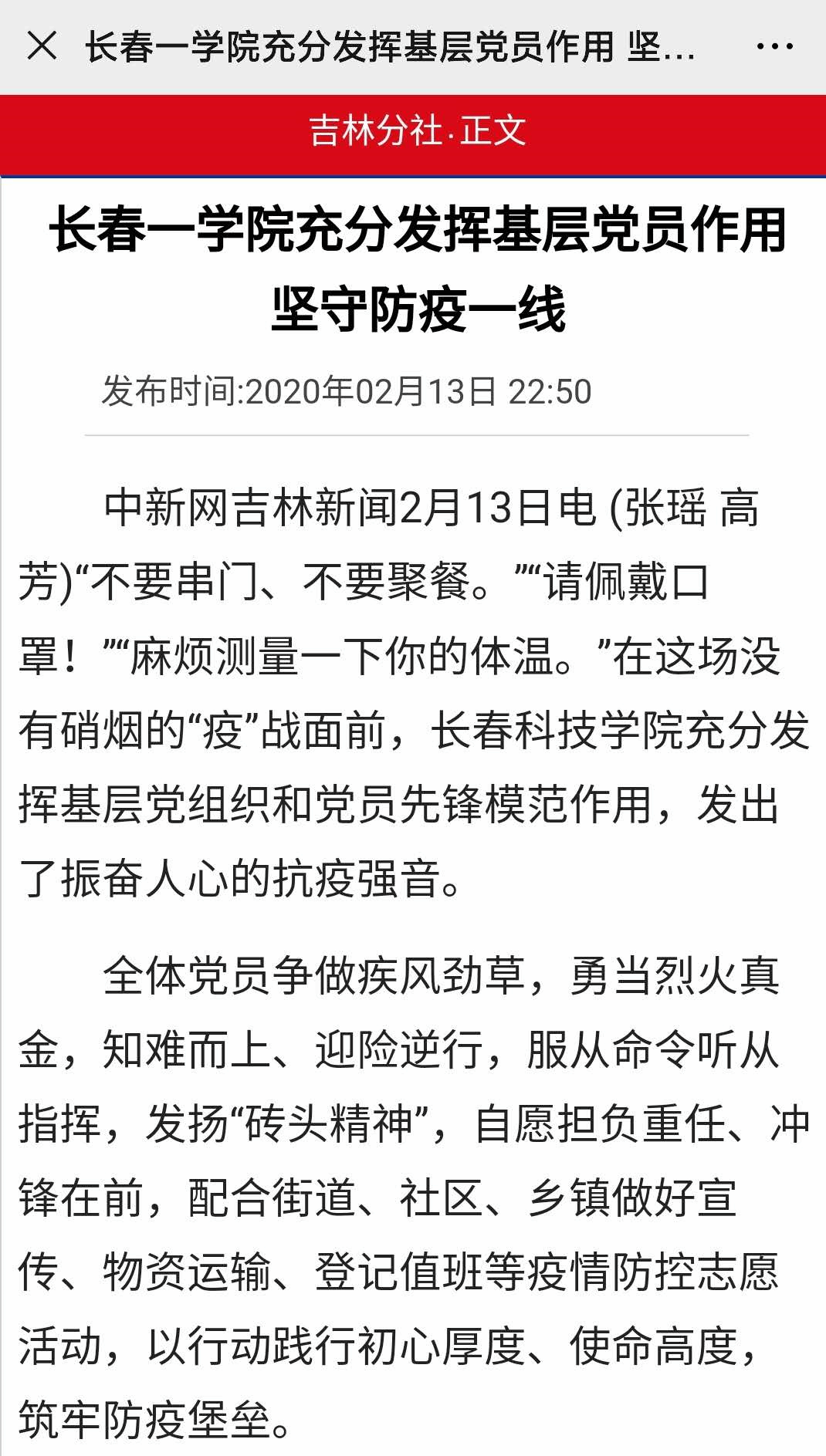 勇于担当,逆行而上。吉林日报彩练新闻、中新网吉林新闻分别以《“疫”线学子,长科“最美身影”》《长春一学院充分发挥基层党员作用 坚守防疫一线》为题报道了学校师生、党员配合街道、社区、乡镇做好宣传、物资运输、登记值班等疫情防控志愿活动感人故事。