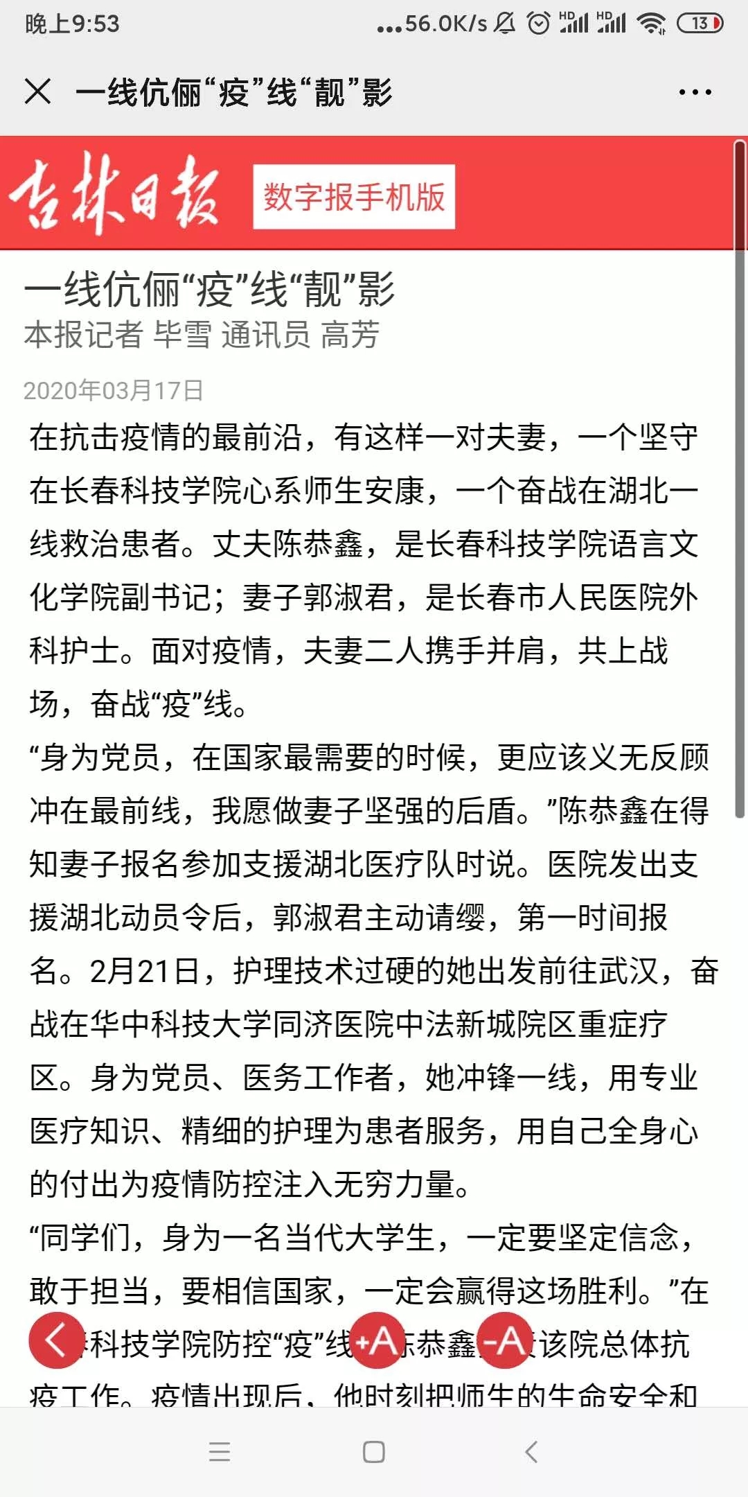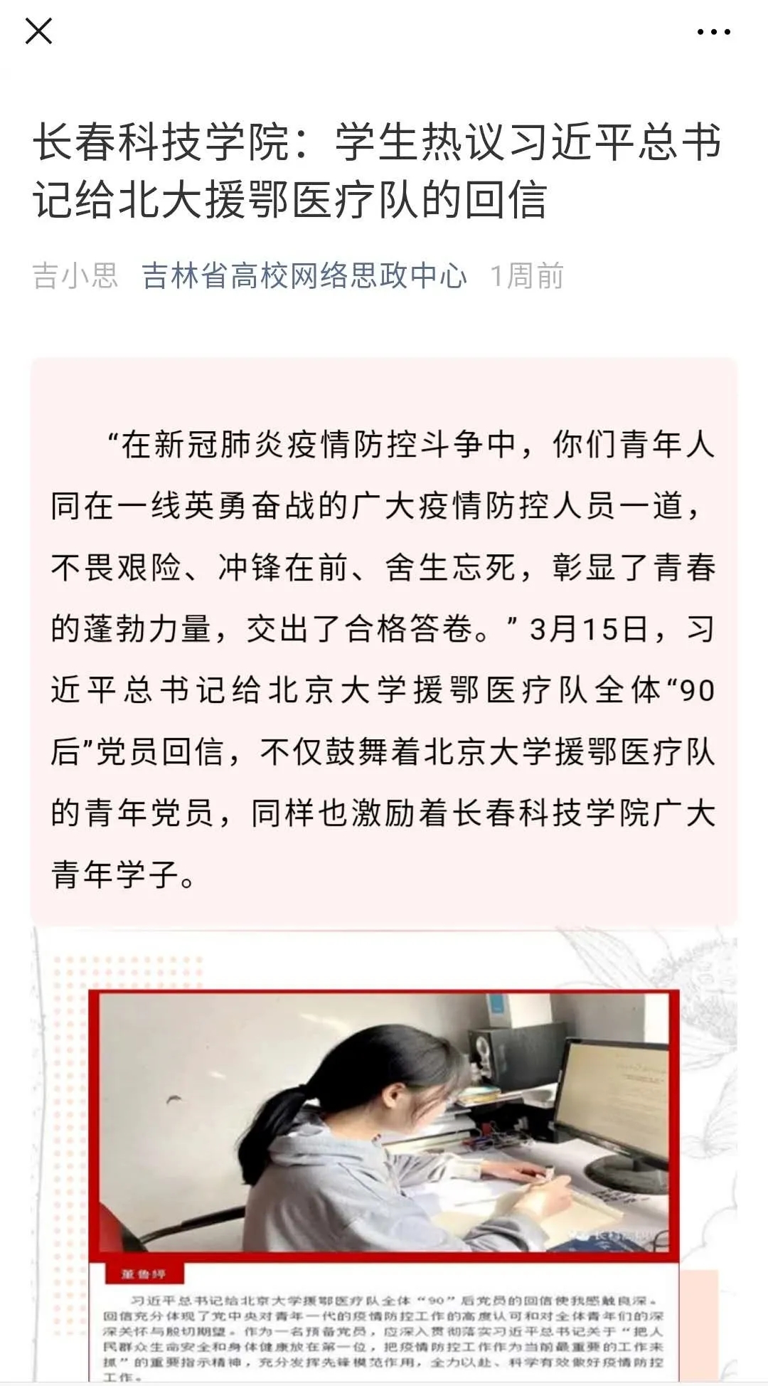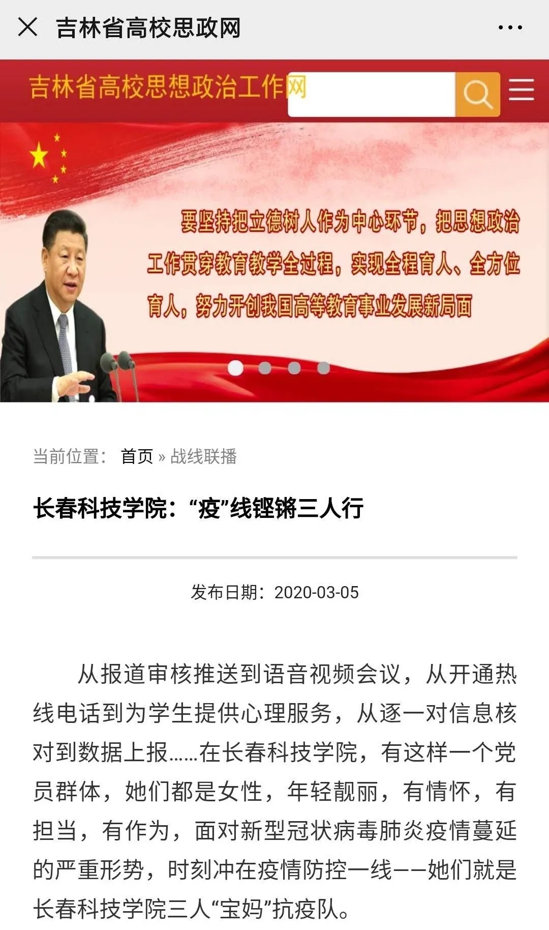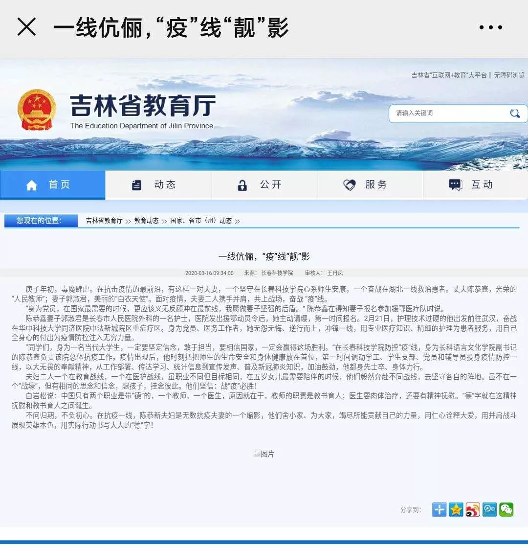 3月2日、9日吉林省高校思政网、吉报教育、学习强国吉林学习平台以《长春科技学院:“疫”线铿锵三人行》、《一线伉俪,“疫”线“靓”影》,《夫妻携手奋战 “疫”线》为题报道了长科宝妈们坚守岗位,守好“责任田”,汇聚同舟共济、众志成城的“她”力量和语言文化学院副书记的陈恭鑫夫妇一个坚守在长科心系师生安康,一个奋战在湖北一线救治患者,并肩战斗展现英雄本色,用仁心诠释大爱的疫线故事。