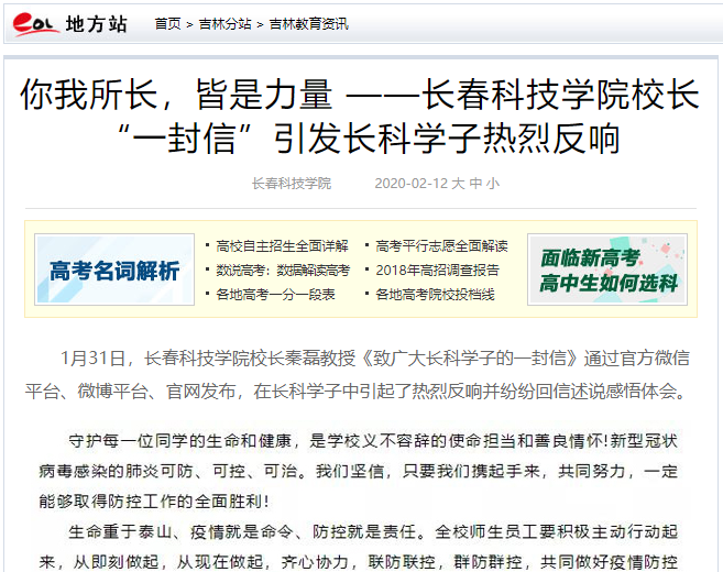 疫情突发,病毒肆虐。结合实际,学校积极作为、多管齐下,形成了“以书信凝心、以倡议聚力”的疫情防控宣传引导工作良好局面,广大师生以文字、绘画、海报、音乐等文创形式,致敬最美“逆行者”,引多家媒体关注。1月31日,长春科技学院校长秦磊教授《致广大长科学子的一封信》通过官方微信平台、微博平台、官网发布,在长科学子中引起了热烈反响并纷纷回信述说感悟体会。2月12日,吉林教育在线以《你我所长,皆是力量 ——长春科技学院校长“一封信”引发长科学子热烈反响》为题给予报道。