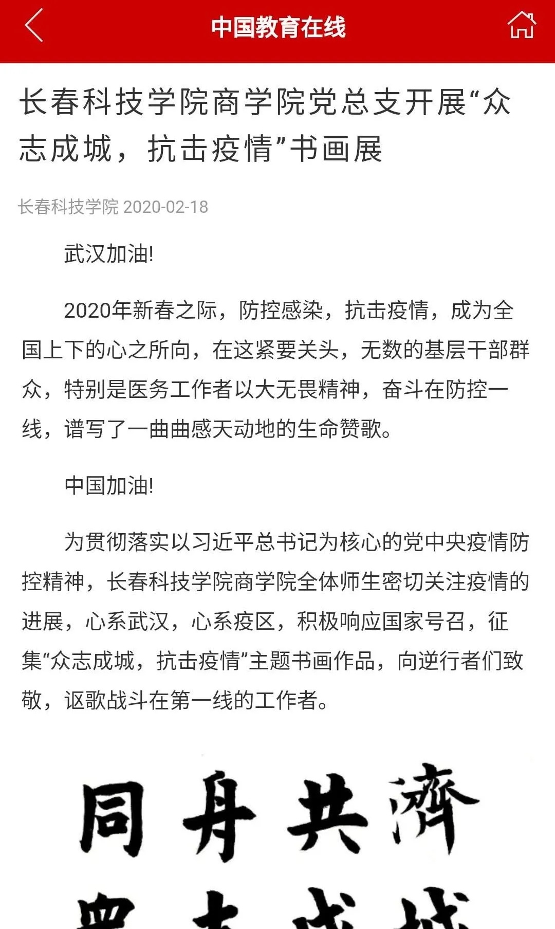武汉加油! 中国加油!长科商学院利用有限资源创作幅幅作品,传递大爱与勇气,讴歌英雄,鼓舞斗志,温暖人心,2月18日,中国教育在线以《长春科技学院商学院党总支开展“众志成城,抗击疫情”书画展》为题进行了报道。