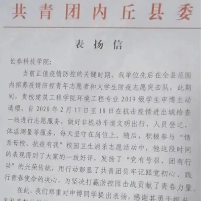 “贵校建筑工程学院环境工程专业2019级学生申博主动请缨,自2020年2月17日至18日在抗击疫情进出城检查线进行志愿服务,做好非机动车道文明出行、人员登记体温测量等服务,用行动彰显了共青团员牢记跟党初心、践行青春使命决心……”河北省邢台市共青团内丘县委专门写下感谢信。申博,长科建筑工程学院一名普通的共青团员,“疫”线,他不畏艰险、冲锋在前,全身心投入到志愿服务工作中,连续奋战多个日夜,用尽全力守好防线,彰显了青春的蓬勃力量,交出了合格答卷。