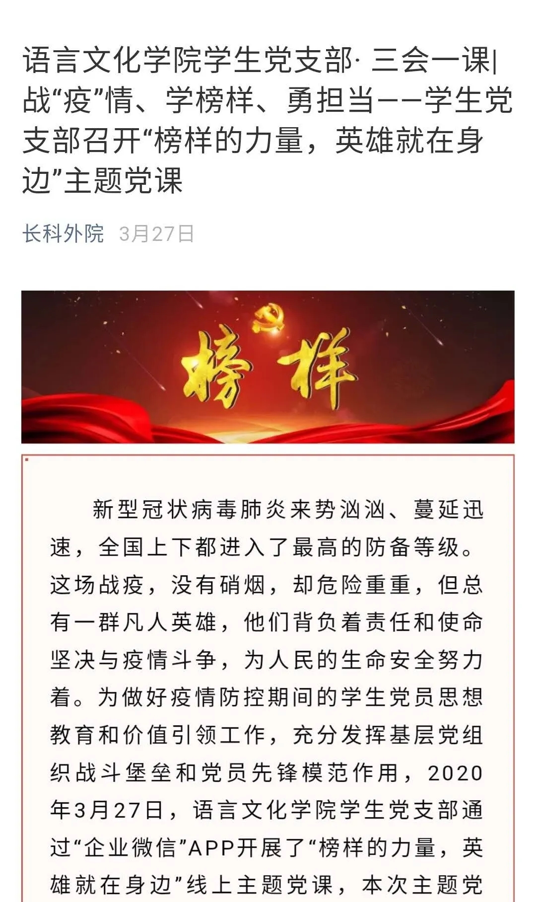 同时开展“疫情防控做表率,践行初心担使命”线上主题党日活动,组织《战疫,我们在一起》主题党课,扎实推进党的建设,形成打赢疫情防控阻击战的强大合力。