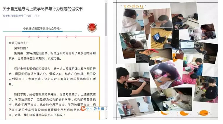 为帮助同学们正确认知线上学习,学生工作处制定了《关于疫情期间线上教学学生管理工作的通知》《关于自觉遵守网上教学纪律与行为规范的倡议书》,对学生提出具体学习要求,并进行监督检查。