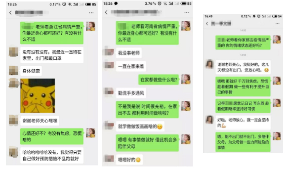 每当她看到通过自己的努力使得学生心情舒缓,不在焦虑恐慌时,内心充满着幸福感,心理辅导外的空闲时间,她积极参加网上抗疫心理援助相关课程培训,学习心理援助技巧与心理防护知识专题来不断充电。她利用自身能力与特长,坚守辅导员“辅生安心”的岗位阵地,为控制疫情尽自己的一份责任。她朴实而简单的想法,虽不是惊天动地的行为,却彰显着教育人的情怀,温暖着病毒肆虐的寒冬!(学生记者:谷语)