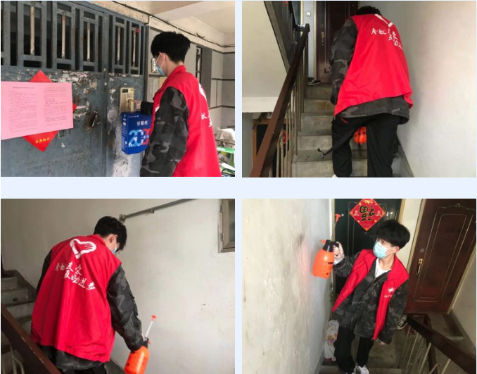 面对不断扩散的疫情,我院大学生预备役队员18级视觉传达设计一班的杨程同学寒假期间没有选择做“宅男”,而是在寒冷的天气下选择走出去,在浙江地区第一时间爆发病毒时就自愿参加防疫工作,为社区的防疫站点记好车辆信息,提醒居民的个人防护工作,定时为居民楼喷洒消毒水,热情的为在家行动不便的老人送上慰问,并向老人家普及有关疫情的防控知识及防控措施,为社区内的防疫工作奉献自己的微薄之力。
