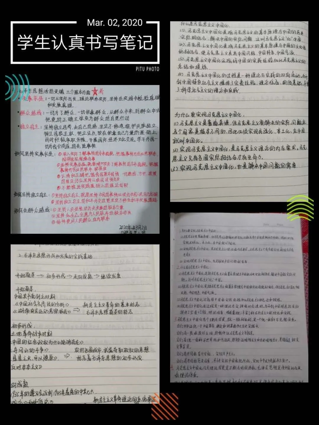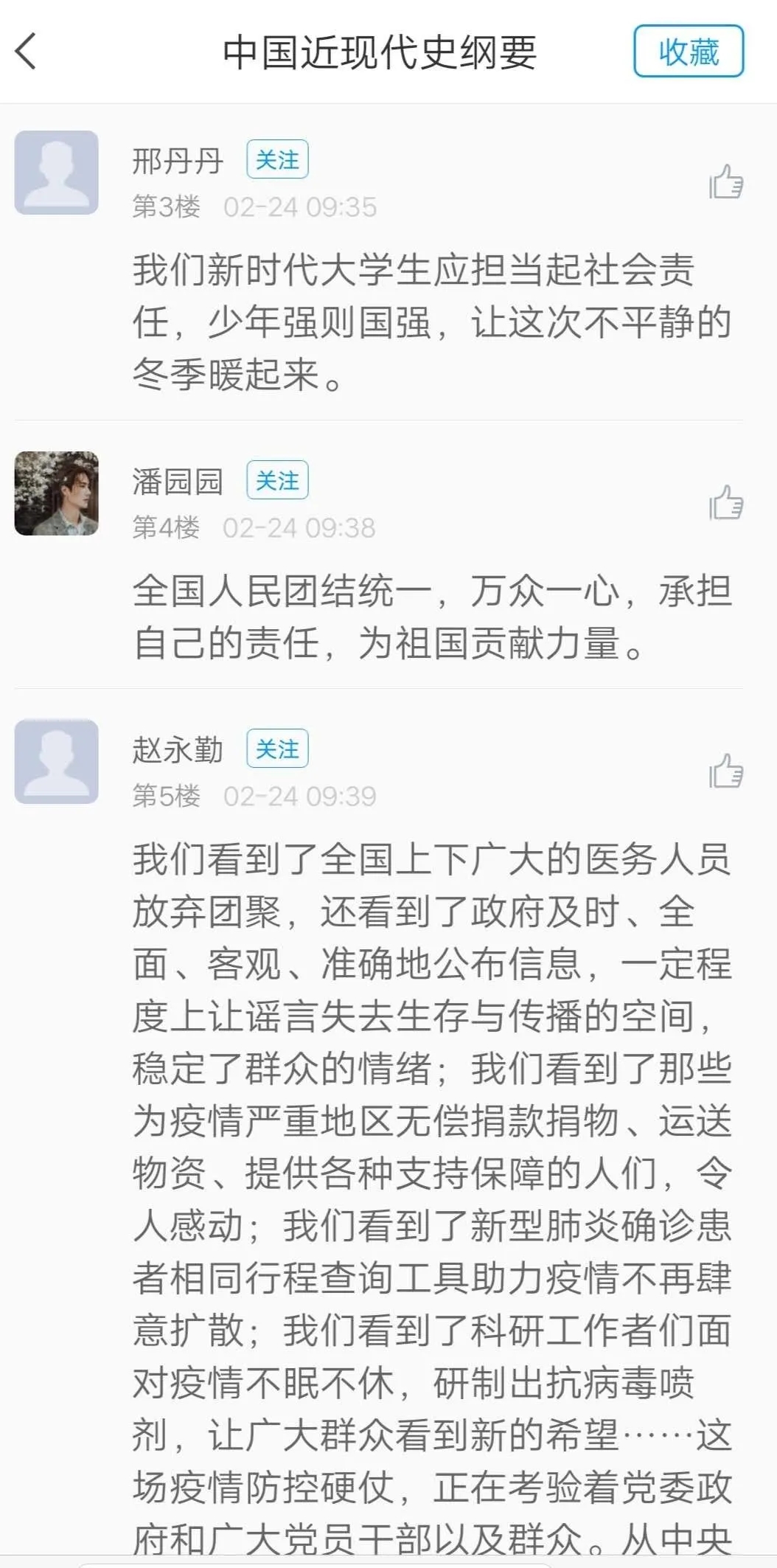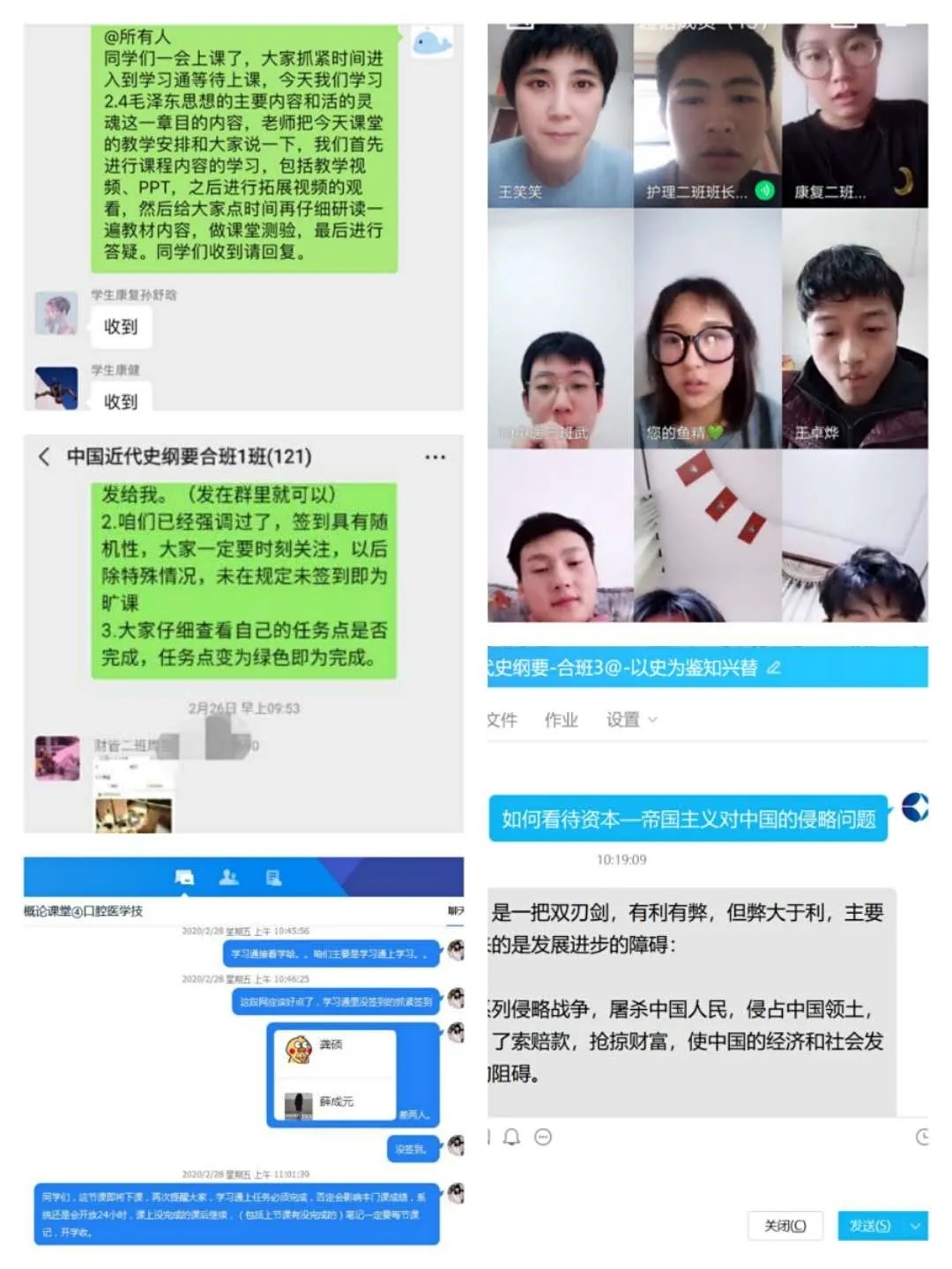 马克思主义学院本学期开设课程涉及到学校7000余名学生,我们通过超星班级群,QQ群、微信群,及时关心学生对课程反馈意见,和学生进行课上课下不间断的联系,解答学生的问题,与学生进行讨论。学生学习端正,即便在家也一刻不松懈,并及时记下课堂笔记、积极在家准备考研和各种资格证的学习。“老师给我们提供的学习资料特别丰富,我们要珍惜每次学习机会,认真对待每一堂课,这也是为国家做贡献”,一名学生的体会。