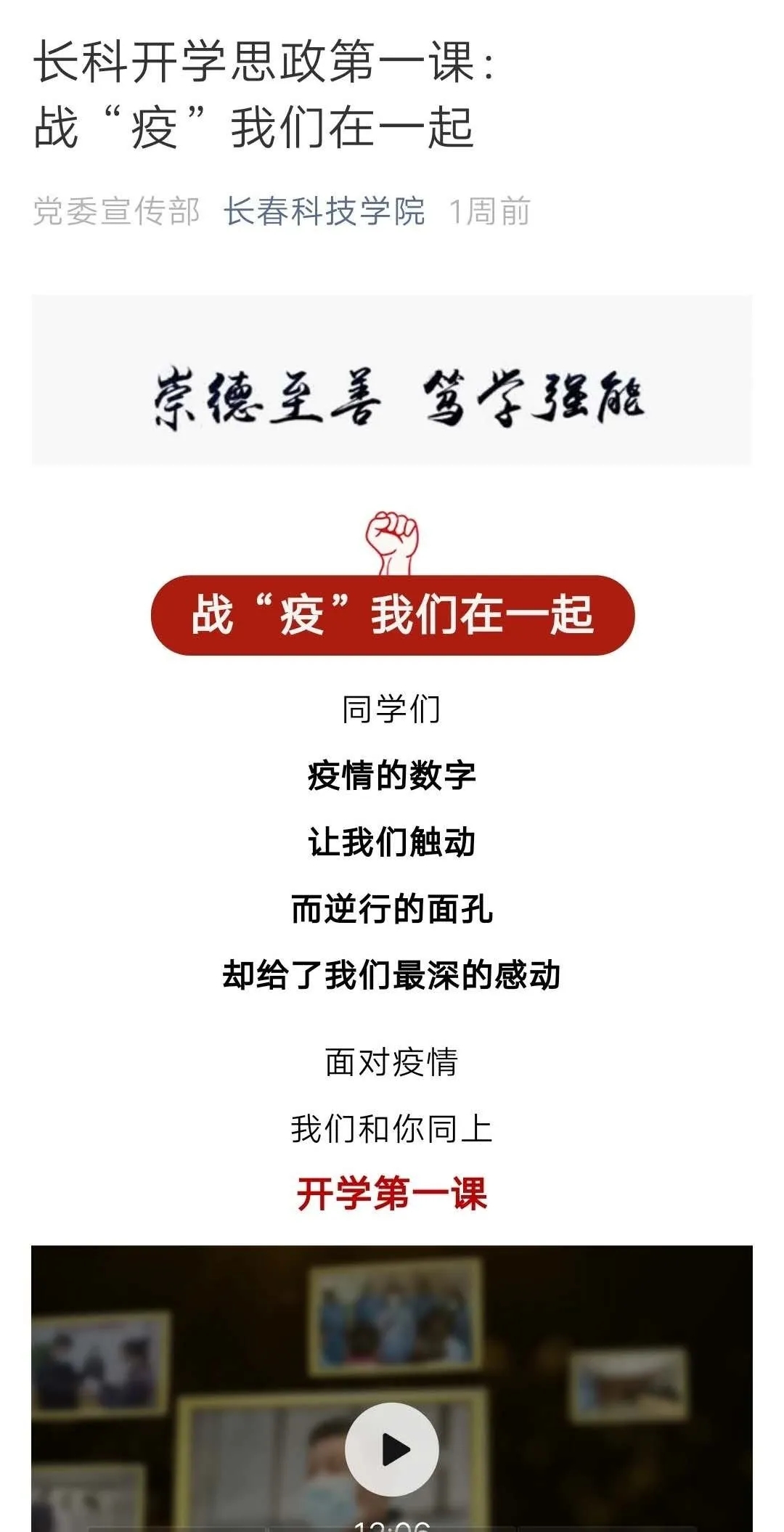 我们每个人都是战“疫”中的一员,面对疫情给学生带来的思想波动,以及新的授课方式的不适应性,马克思主义学院充分发挥思政课课堂主渠道的作用,把《战“疫”我们在一起》作为第一堂课,开启本学期思政课程学习,培养学生的担当与责任,共同战“疫”。