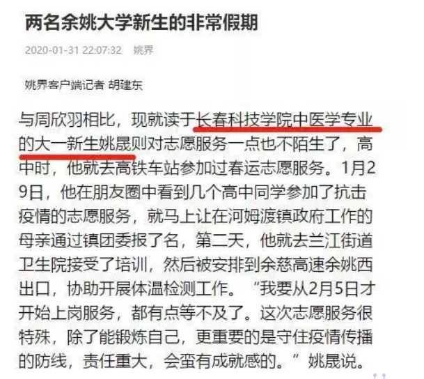 浙江余姚新闻网以《两名余姚大学新生的非常假期》为题对长科学子姚晟参加抗击疫情事迹进行了报道。