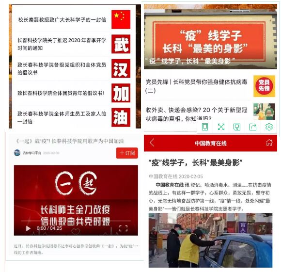党委宣传部、信息化中心充分发挥新媒体矩阵作用,利用校官网、微信平台、微信群等途径,及时发布疫情防控最新消息及有效防控措施,不断加强舆论引导,第一时间处理各种不实不当言论,引导全校师生理性认识,科学防控,消除恐慌,不信谣、不传谣,做自身和家人防控宣传的志愿者和践行者;利用LED屏幕,倡议书,文件通知等做好疫情防控宣传工作,准确发布权威信息;设立战“疫”专栏,广泛普及防疫基本知识和卫生常识,提高学校师生自我防护意识;官方微信平台,官方微博平台,微信群发布《校长秦磊教授致广大长科学子的一封信》《致长春科技学院全体师生员工及家人的一封信》《众志成城,长科和大家一起抗“疫”》《共同战“疫”,长科大学生心理健康教育中心与你在一起》;及时宣传“疫”线涌现的先进典型和突出事迹,传播正能量。《“疫”线学子,长科“最美身影”》先后在《吉林日报》“彩练”新闻、吉报教育“今日头条”、学习强国吉林学习平台发表,长春科技学院为武汉加油音频在教育部思政司、中国大学生在线、西马来亚等平台发布。