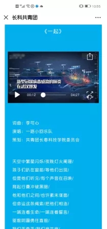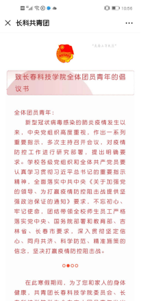 1. 吹响“集结号”,广泛动员团员青年参与“防疫战”。疫情当前长科共青团充分发挥组织优势,通过《致全校团员青年的倡议书》号召各分院团组织和全校青年团员听党指挥,发出齐心协力抗击疫情,踊跃投身疫情防控工作,打赢防疫阻击战贡献青春力量,唤醒每一位团员的初心使命、责任意识和奉献精神。2月4日,学校官方微信平台和团委微信平台推出原创应对疫情歌曲《一起》,这首歌由学校团委书记李可心作词作曲,献给抗击疫情的白衣勇士们,献给与病魔抗战的同胞们,给他们带去心灵的慰藉和力量。歌曲一经推出,受到社会各界的好评,吉林省学习强国平台、吉林日报、双阳融媒体等媒体平台纷纷报道转发。
