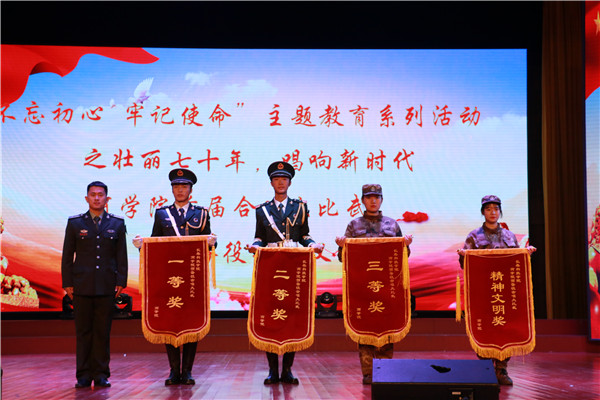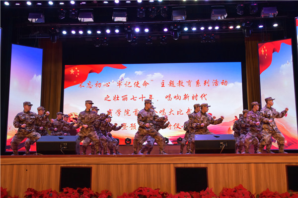 我院2019级全体新生组成的预备役六个连队参与了此次合唱大比武。各参赛连队全体身着军装,以整齐的队列、严整的军容以及饱满的激情惊艳亮相。通过加入领唱、舞蹈、手鼓等元素,创新了合唱形式,深深感染着在场的每一位观众,赢得阵阵喝彩、声声称赞。一首首脍炙人口、催人奋进的歌曲抒发了同学们保家卫国的拳拳之心和浓浓的拥军之情,同时也展现出了同学们团结协作、奋勇拼搏、创新发展的精神风貌。