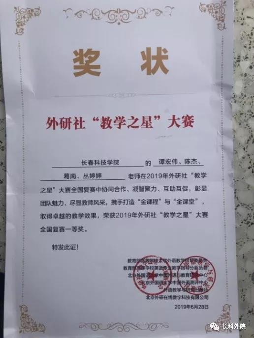 语言文化学院谭宏伟、陈杰、葛南、丛婷婷教师团队荣获2019年外研社“教学之星”大赛英语专业组全国复赛一等奖。