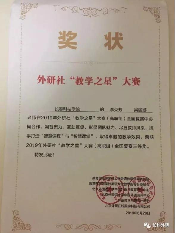 语言文化学院李炎芳、吴丽娜教师团队荣获2019年外研社“教学之星”大赛高职组全国复赛三等奖。