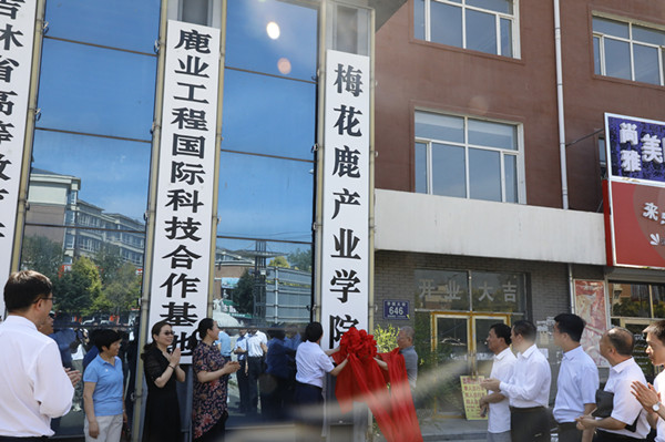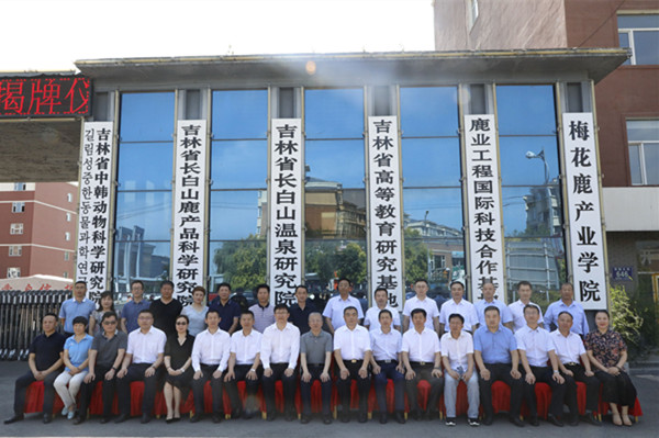 10时18分,在长春科技学院正门,与会嘉宾、省市区各级领导、学校领导共同为长春科技学院梅花鹿产业学院揭牌并合影留念。