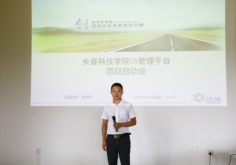 来自泛微科技的厂商代表分别从泛微公司介绍、项目总体目标、项目组织保障、项目实施策略及计划、项目实施风险及误区五个方面进行对学校OA管理平台进行了汇报。厂商代表表示新建的信息化平台重点建设五大应用中心。