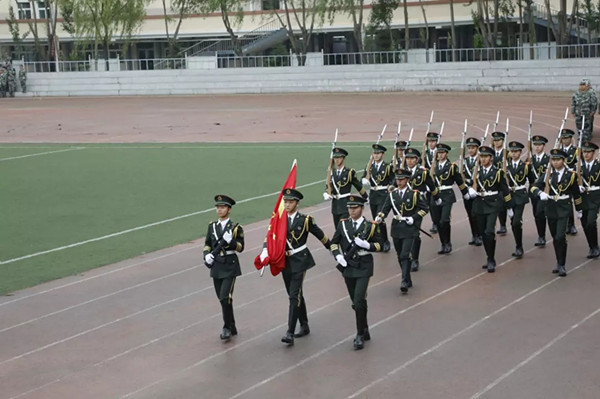 12时,授旗仪式开始,预备连整齐列队,全场高唱国歌。仪仗礼兵护卫着预备连连旗,正步行进到主席台前,校长郑重向预备连连长曾建授旗,党委书记陈延民向预备连指导员兰天授牌。