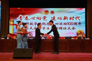 本次大会在雄壮的国歌声中拉开了序幕。大会开始,李可心书记总结了近一年来我校做的一系列工作和取得的成绩,言辞诚恳,极大的激励了我校广大师生为校争光的决心和信心。会上,宣读了大会表彰文件以及《第十七届校学生干部聘任决定》。伴随着的激昂的乐声,与会领导分别为受到表彰的先进集体、优秀个人代表颁发了奖牌和荣誉证书;校党委副书记宋学山为张浩等校学生会、社团联合会学生干部颁发了聘任证书。接着教师代表语言文化学院党总支副书记陈恭鑫、学生代表校学生会主席张浩先后做了大会发言,话语恳切、真诚勉励广大长科学子铭记五四历史,为实现中华民族伟大复兴的中国梦而努力奋斗。