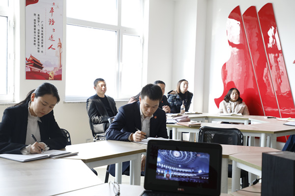 学校党委书记陈延民、副书记宋学山、党委常委宣传部长、统战部长高芳同二支部所有党员一起共同观看了会议盛况。