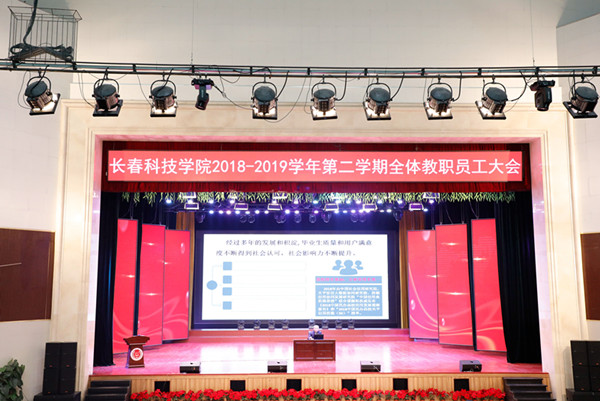 会上,校长发表了题为《静心沉潜,坚守争上——为创建高水平应用型大学而努力奋斗》的讲话。他充分肯定了学校在各方面工作中取得的突出成就,指出学校办学条件明显改善,办学规模稳步增长,办学水平持续提高,办学特色日益彰显,现代大学制度逐步完善。他强调,在过去的一年,全校教职工统一思想、把握方向、肩负使命、担当责任,圆满完成了教育部对学校本科教学工作的审核评估。学校诚信建设得到社会认可,在《2018中国民办高校信用发展观察报告》和“2018中国民办高校天平信用指数(50)”榜单中实力占优,位列第30,吉林省排名第一;赵中岳教授主持的项目荣获省教学成果二等奖;数百余名学生在全国数学建模大赛、全国大学生创新会计人才技能大赛等各类学科技能大赛中获得了喜人的成绩。