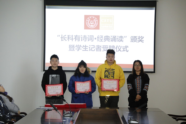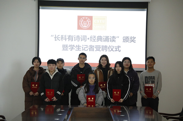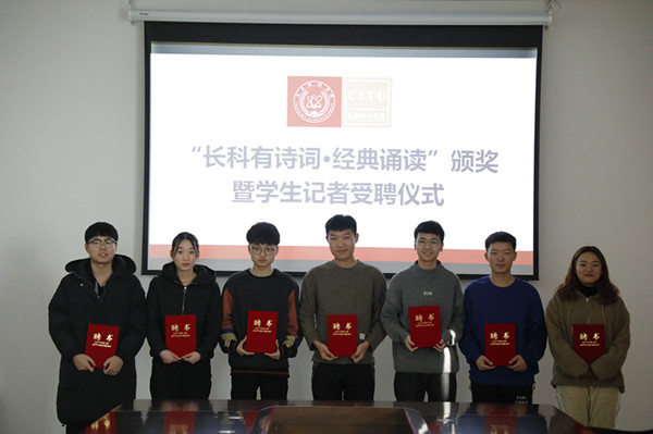 12月25日,党委宣传部主办的“长科有诗词,经典诵读”颁奖暨学生记者受聘仪式在行政楼403会议室举行。新闻编辑部主任佟风华、党委宣传部全体老师以及获奖的同学和受聘学生记者参加了仪式。党委宣传部勤工助学岗媒体工作室助理教师张绍娜主持了仪式。
