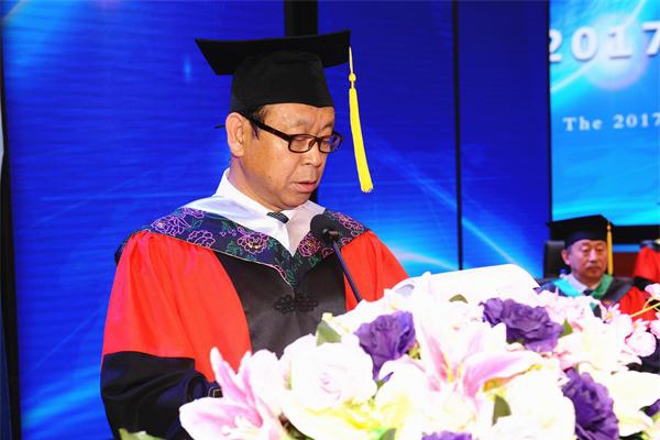 8点30分,毕业典礼在雄壮的《国歌》声中开始。副校长、校学位评定委员会副主任盖同祥宣读了《关于2017届应届本专科学生准予毕业的决定》和《关于授予2017届毕业生学士学位的决定》;副校长、校学位评定委员会副主任王艳梅、谢文义、欧阳军先后宣读了《关于表彰2017届优秀毕业生的决定》和《关于表彰职业技术学院2017届取得专升本资格学生的决定》。迎着毕业生热切期待的目光,伴随着欢快的乐曲,与会领导为取得专升本资格的同学颁发奖金并为获得“优秀毕业生”荣誉称号的同学颁发证书。校学位评定委员会主任、副主任等与会领导先后为2017届2681名获得学士学位的学生拨过帽穗,颁发学位证书和授予学士学位;为职业技术学院2017届885名专科生颁发毕业证书,并与之合影留念。