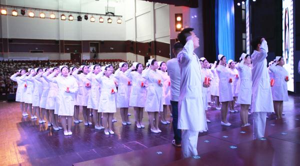 随后,举行了庄严神圣的授帽仪式,6位资源护理专家为医药学院2015级60名学生代表戴上洁白的燕尾帽,递上燃烧的红蜡烛,全体护理专业学生起立并举起右拳,庄严宣誓南丁格尔誓词,表达了对护理事业奉献终身的信念及将护理事业发扬光大的决心。随着悠扬的乐曲声,医药学院学生为大家表演了手语《感恩的心》,太极拳、瑜伽《中华魂》和舞蹈《风韵雨忆》等精彩节目,点燃了现场观众的热情,赢得了阵阵喝彩声音和掌声。