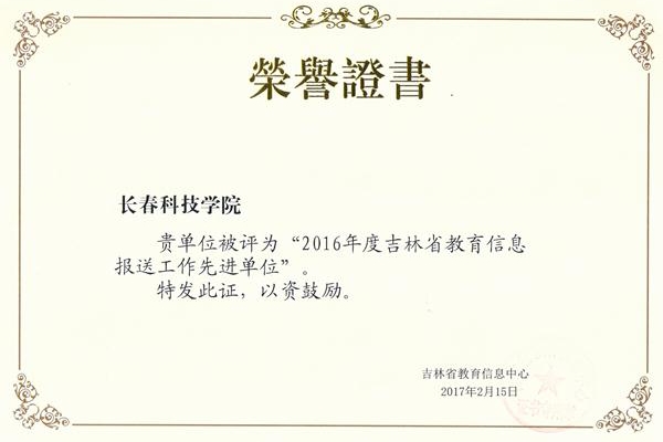 近日,吉林省教育厅下发了《关于表彰2016年度吉林省教育信息报送先进单位及个人表彰的通知》,长春科技学院被评为“2016年度吉林省教育信息报送工作先进单位”称号。同时,教育技术中心主任高芳、孟祥杰、于南飞被评为“信息报送先进个人”,其中王丹凤还被评为“信息审阅先进个人”,这是我校连续三年获此殊荣。