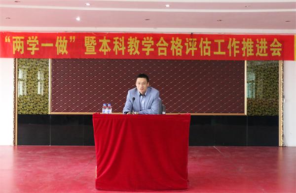 会上,党建工作部部长李宗才作了题为《践行“两学一做”,争当评建先锋》的报告。他指出,开展“学党章党规、学系列讲话,做合格党员”学习教育,这是党中央为深化党内教育作出的又一重要部署,学校党委按照上级工作要求制定了学习教育《实施方案》并已下发, 2016年也是我校“十三五”工作开局之年,“十三五”规划起步、转型发展和本科教学合格评估是我校2016年工作的重心,开展“两学一做”学习教育是今年党建工作的龙头任务,全体党员要以此为契机,乘着“十三五”工作开局之年的东风,以全新姿态为年度工作、为迎评、为转型、为学校发展尽一份心一份力,发一份光。学校各级党组织和广大党员,要充分认识开展“两学一做”学习教育的重要意义,切实增强责任感、紧迫感;要准确把握总体要求,确保“两学一做”学习教育扎实有序开展;要强化问题导向,把解决问题贯穿学习教育全过程;要狠抓整改,把“两学一做”与本科教学工作合格评估有机融合;要切实加强对学习教育的组织领导,确保学习教育工作落到实处。