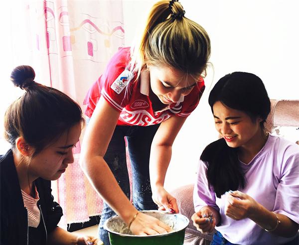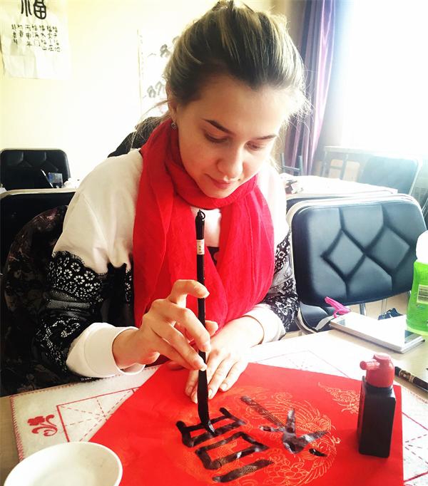 在老师的组织下,留学生们纷纷提笔、着墨,聚精会神地书写起了春联,有刚正不阿的楷书,有古色古香的隶书,有潇洒飘逸的行书。留学生们挥毫泼墨、一笔一划、认真专注,临摹出气韵生动的毛笔字,一幅幅颇具神韵的书法作品展现出了留学生对中国古老文化的向往和喜爱。在老师和同学的示范下,留学生们从和面、切菜到剁馅再到包饺子,全程积极参与。俄罗斯男孩自告奋勇拿起擀面杖将面团制作成饺子皮,然后其他留学生纷纷用饺子皮将青椒猪肉馅包起来,捏成各种各样的饺子。