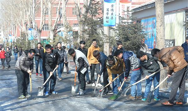 人,但同学们热情高潮,干劲不减。同学们挥动铁锨、雪铲和扫帚争先恐后地坚硬的冰雪铲起堆在道路两旁的树坑里;他们的双手冰得
