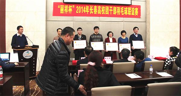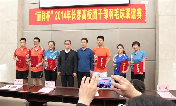 经过近2小时的激烈角逐,比赛结果揭晓:团干部武强、武军荣获“丽祥杯”2014年度长春市 高校团干部羽毛球联谊赛混双冠军;团干部赵立夫、武强荣获“丽祥杯”2014年度长春市高校团干部羽毛球联谊赛男双冠军 ;校团干部武军荣获女单亚军;学校荣获本次比赛优秀组织奖。