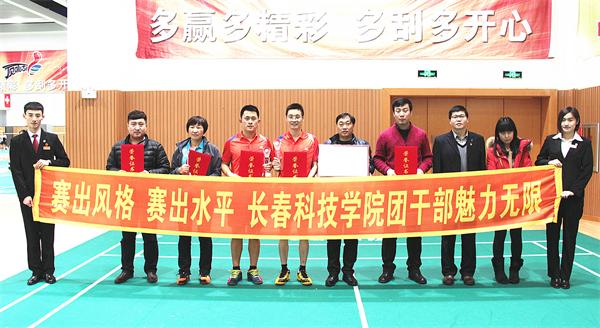 20日13时左右, 我校团干部赵立夫、武强、武军一路挺进决赛,代表我校与其他高校一比高下。决赛项目为与长春信息职业技术学院代 表队进行混双决赛,与长春中医药大学团干部进行女单决赛,与吉林大学的团干部进行男双决赛,双方实力不相上下,比赛场面激烈。