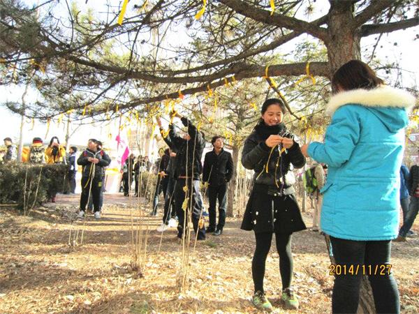 当日白天的活动主要为写、贴感恩心愿贴,在一舍门前的感恩树挂上黄丝带。许多同学在工作人员手中接过便利贴,写下自己的感恩话语并贴于“爱的心墙”上。并拿过黄丝带,将心底的祝福连同黄丝带一起系在树上,愿那份祝福随风飘到亲人们身旁。