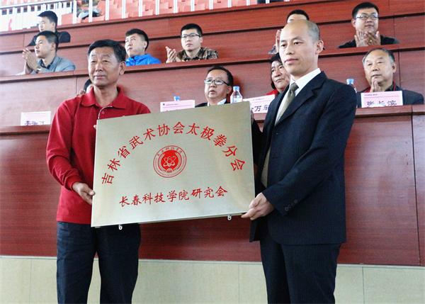 伴随着欢快的乐曲声,吉林省武术协会太极拳分会会长丛德顺为长春科技学院研究会授牌,全场一片欢腾。