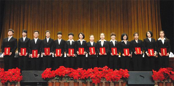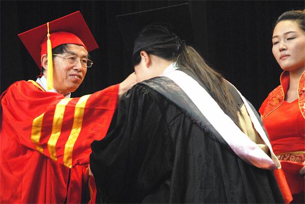 9点整,典礼在雄壮的《国歌》声中开始。副校长赵中岳教授宣读了《关于2014届毕业生准予毕业、结业的决定》和《关于授予2014届毕业生学士学位的决定》。党委副书记、副校长李华楠教授宣读了《关于表彰2014届优秀毕业生的决定》,与会领导为2014届毕业生代表颁发了毕业证书并为55 名“优秀毕业生”代表颁发荣誉证书,校学位评定委员会主席、校长宗占国教授亲切地为1887名获得学士学位的学生代表拨过象征毕业生已学有所成,可以展翅高飞的流苏,颁发学位证书和授予学士学位,并与之合影留念,将卓尔不群的炫彩瞬间定格为永恒。