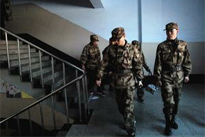 当第二声警报声响起时,各楼层负责人立即将演练总指挥王东红“突发强烈地震,组织学生疏散”的指令传达到各个教室,各班班主任、任课老师组织学生抱头迅速有序地跑出教室,成一路纵队,紧贴墙角,按指定路线快速下楼;医疗救援小分队火速冲上楼梯,用担架将受伤学生转移至安全地带,进行简单的伤口处理;应急破门员以迅雷不及掩耳之势将四个正门、东西二个防火通道全部打开……按预案演练井然有序地向运动场紧急疏散。短短3分钟时间,所有参加演练的师生全部按时到过指定地点集结,并按班级迅速列队,随后辅导员和班干部快速清点人数,及时上报指挥部。