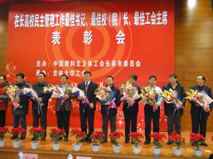 为学习贯彻党的十八精神,表彰高校民主管理工作先进典型,推动高校民主政治建设,加强与高校党政领导的联系,促进高校工会工作,12月6日9时许,市工会在吉林大学图书馆报告厅举行了在长高校民主管理“最佳党委书记”、“最佳校长”、“最佳工会主席”表彰会及党政工领导联谊活动,在长25所院校的近百名党政领导与会。