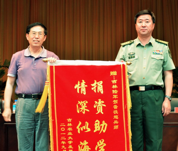为了表达吉林农业大学发展学院师生对捐资者的谢忱,校长兼党委书记宗占国代表学校向吉林陆军预备役炮兵师赠送了“捐资助学 情深似海”的锦旗。