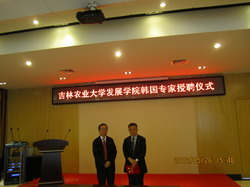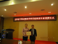 为深化合作、引进优质人才资源,26日下午,在我校学生实习实训基地御龙温泉度假村会议室举行了吉林农业大学发展学院、吉林省中韩动物科学研究院授受聘书仪式。副校长赵中岳为韩国庆北大学李相武教授颁发了吉林农业大学发展学院客座教授聘书;副校长、吉林省中韩动物科学研究院院长王艳梅为李相武教授颁发了吉林省中韩动物科学研究院客座研究员聘书。其后,双方就吉林省中韩动物科学研究院实验基地后期管理及实验方法等方面的问题进行了建设性交流与探讨。